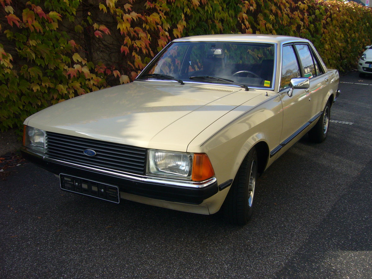 Ford Granada MK2 in der Karosserieversion viertürige Limousine, wie er von 1977 bis 1981 in den Werken Köln und Dagenham/GB produziert wurde. Der "Granny" konnte mit etlichen Motorisierungen bestellt werden. Der gezeigte Wagen ist mit dem häufig georderten V6-Motor mit einem Hubraum von 1988 cm³ und einer Leistung von 90 PS ausgerüstet. Nach den Werksferien 1981 erfolgte ein "Facelift". Der Granada wurde dann noch bis 1985 weiter produziert. Besucherparkplatz der Düsseldorfer Classic Remise am 31.10.2020.