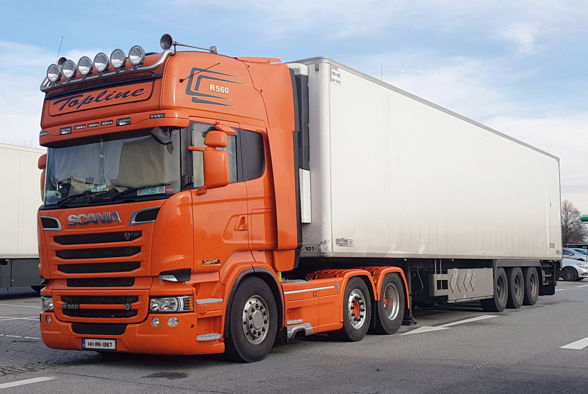 =Scania R 560-Topline von Irland rastet im Dezember 2019 auf einem Rastplatz an der A3