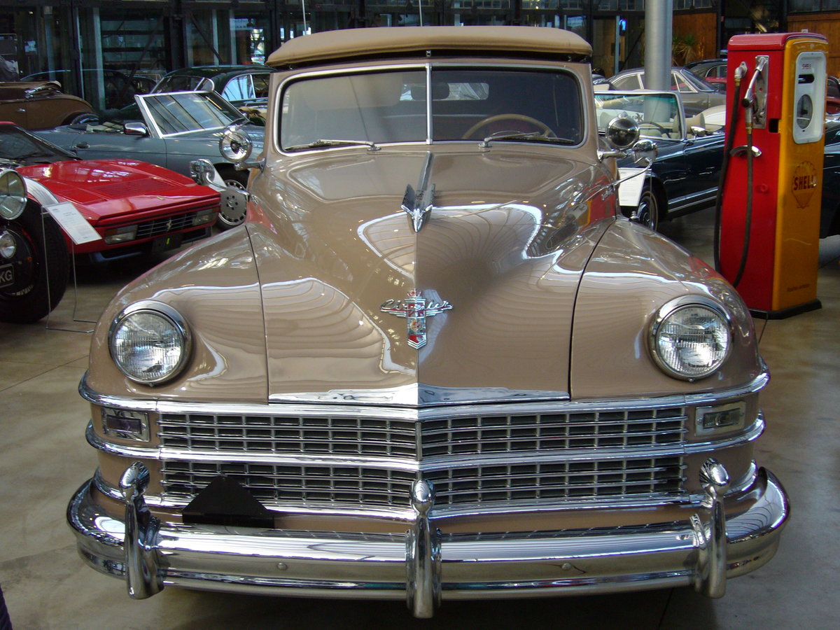 Chrysler Town & Country Convertible von 1946. Da auch die Chrysler Corporation im WW2 auf Rüstungsproduktion umstellen musste, liefen die letzten zivilen PKW 1942 vom Band. Die Nachkriegsproduktion lief im November 1945 wieder an. Im Grunde wurden die Vorkriegsmodelle mit kleinen optischen Retuschen auf den Markt gebracht. Die Holzaufbau der sogenannten "Woodys" bestand aus Eschenholz, das extra von der Chrysler-Tochterfirma Pekin Wood Products aus Arkansas aufbereitet wurde. Ein solcher Woody kostete im Jahr 1946 mindestens US$ 2743,00. Angetrieben wird der Wagen von einem Achtzylinderreihenmotor mit einem Hubraum von 323,5 cui (5301 cm³) und einer Leistung von 135 PS. Classic Remise Düsseldorf im Januar 2019.