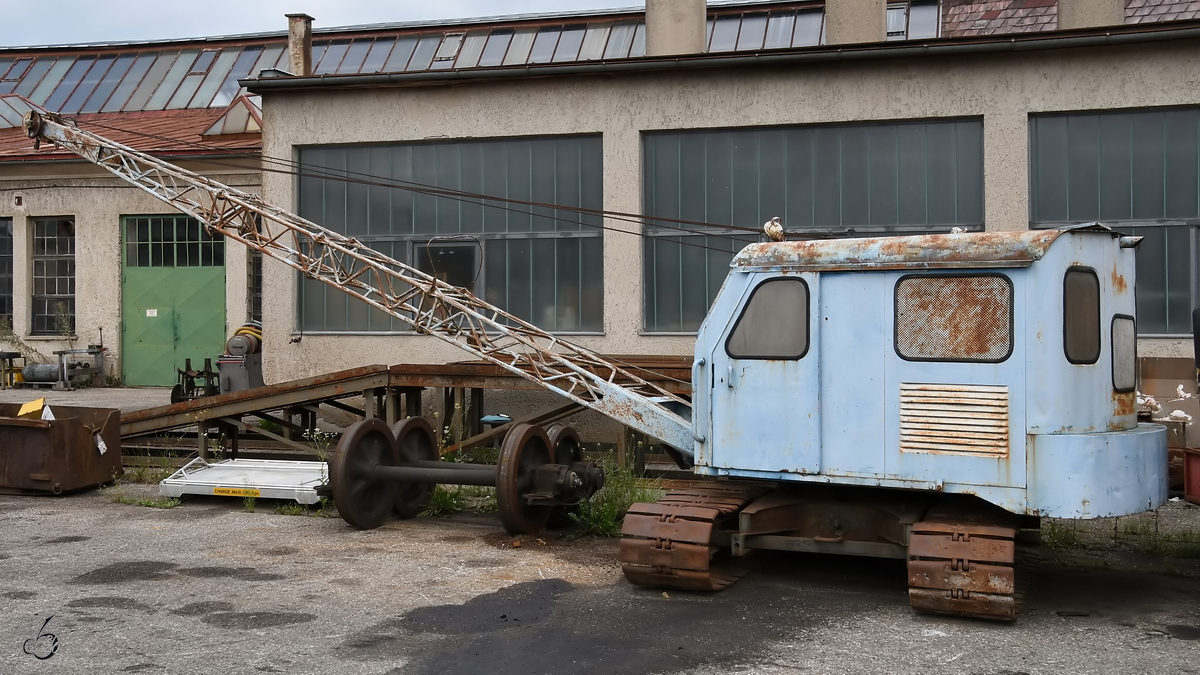 Ein 1987 gebauter Raupendrehkran RDK 200 mit hochgestellter Fahrerkabine stand Anfang November 2020 im Hafen von Jarmen.