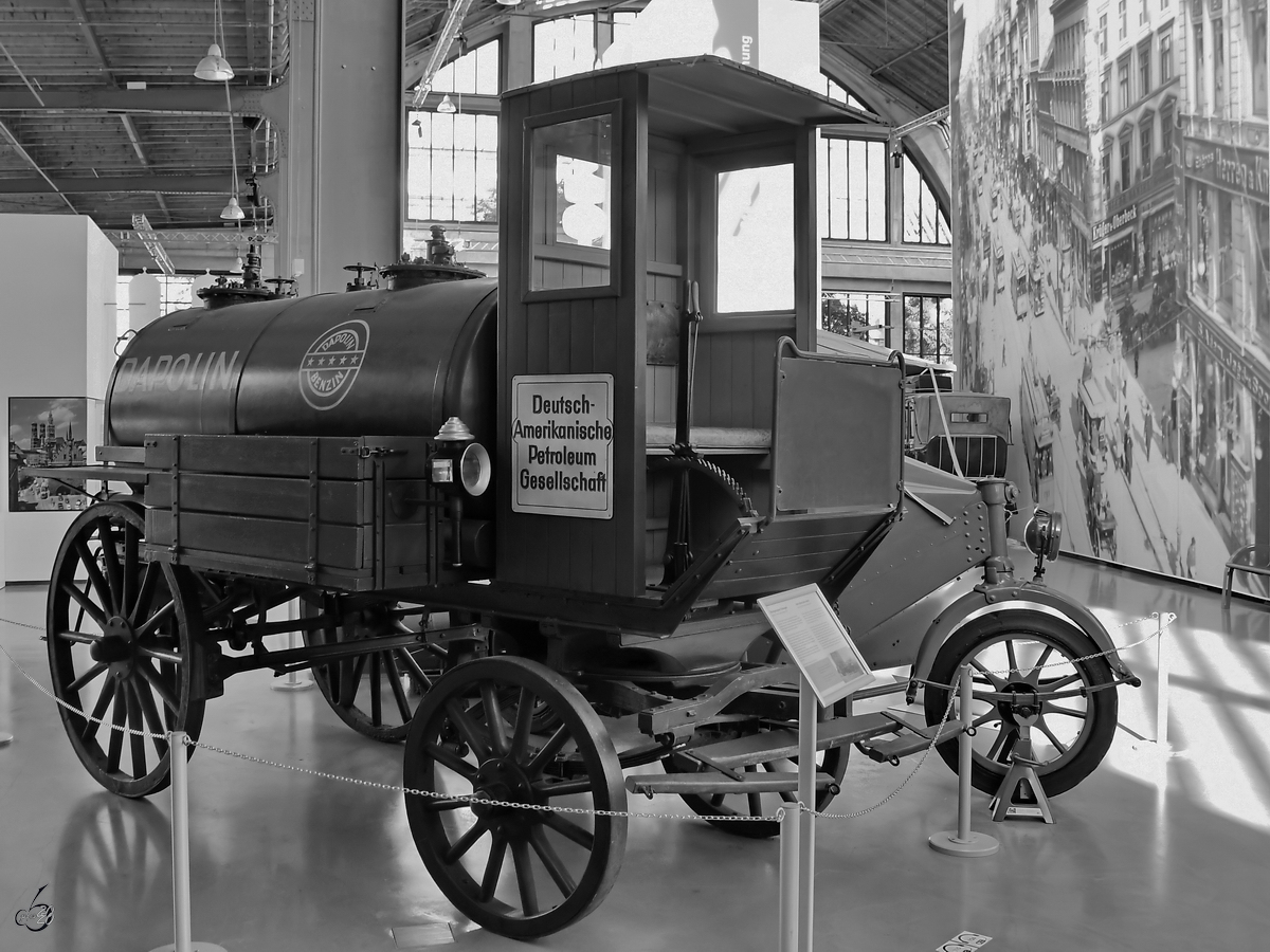 Ein pferdegezogener Tankwagen von 1909 war Mitte August 2020 im Verkehrszentrum des Deutschen Museums in München ausgestellt.