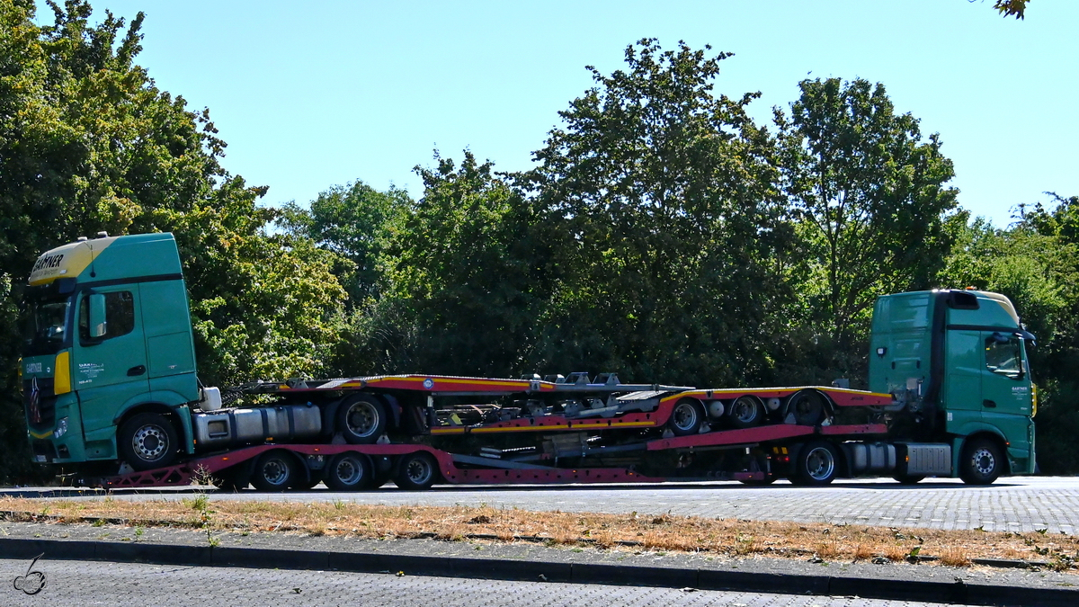 Mercedes-Benz Actross im Doppelpack, so gesehen Anfang August 2020 auf einer Raststätte an der Autobahn A3.
