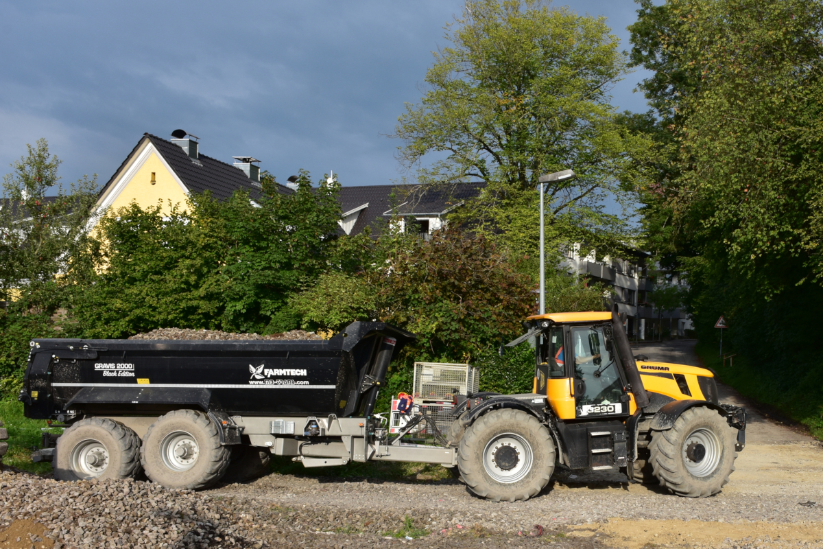 Traktor JBC Fastrac 3230 mit Hänger (Schwerlastmulde) Farmtech Gravis 2000 am 01.09.2019 in Lindau auf der Bahnbaustelle beim Übergang Holdereggenstraße