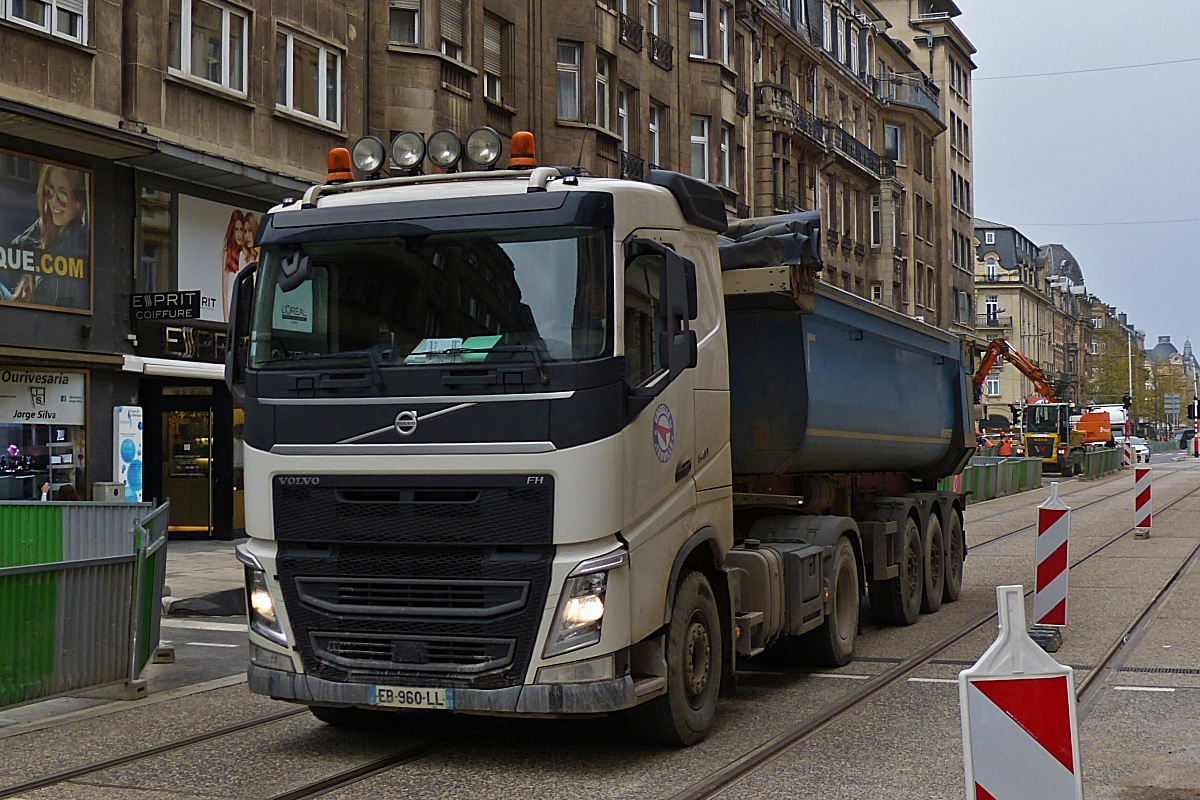 Mercedes Benz Axor Absetzkipper, fährt über die Straßenbahnstelle nahe dem Bahnhof von Luxemburg. 18.11.2020