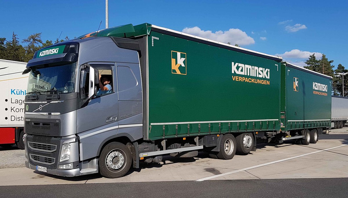 =Volvo FH 420-Hängerzug von KAMINSKI-Verpackungen steht auf einem Rastplatz an der A 7, 08-2020