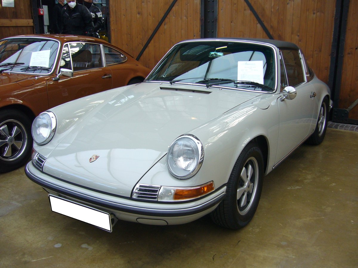 Porsche 911S 2.4 Targa, gebaut von 1971 bis 1973. Der gezeigte "Targa" stammt aus dem Jahr 1972 und ist im Farbton beigegrau/622 lackiert. In Grundausstattung kostete ein solches Targamodell bei seinem erscheinen im August 1971 DM 32.900,00. Der gebläsegekühlte Sechszylinderboxermotor mit einem Hubraum von 2341 cm³ leistet 190 PS und verhilft dem Wagen zu einer Höchstgeschwindigkeit von 230 km/h. Classic Remise Düsseldorf am 31.10.2020.