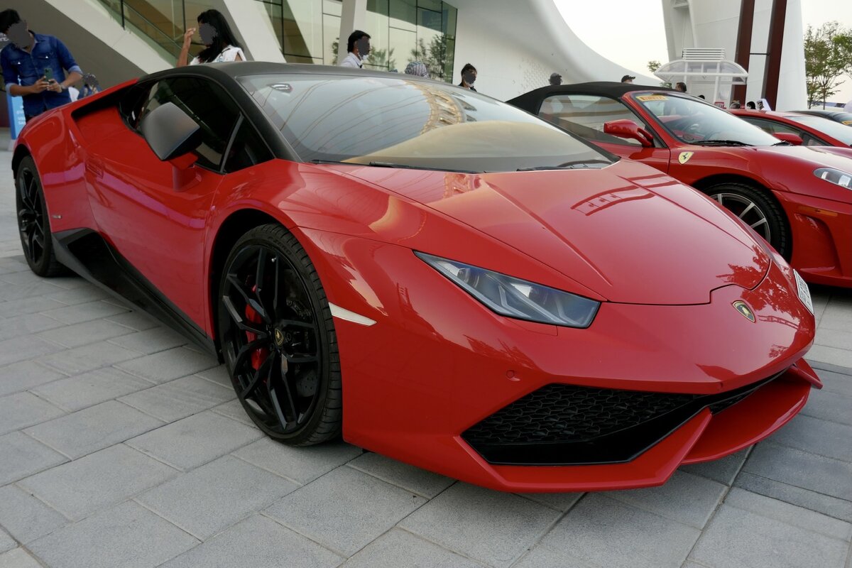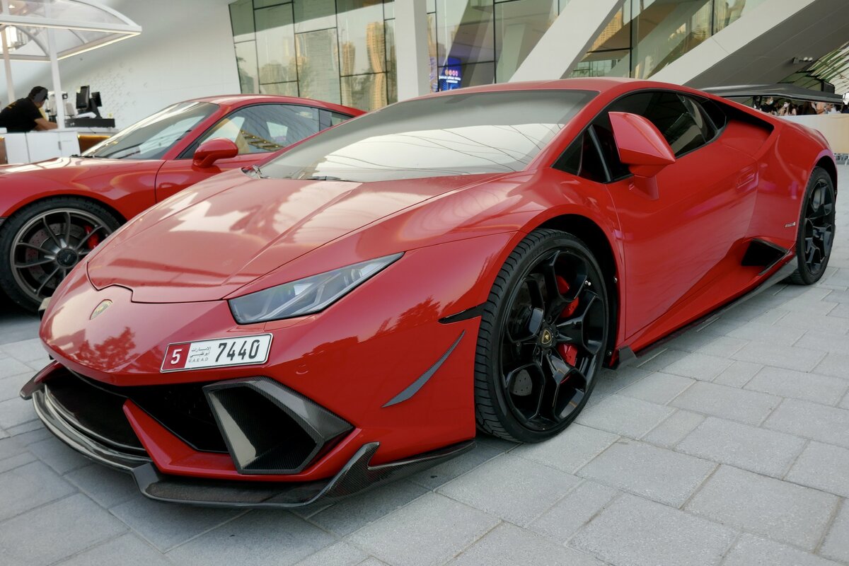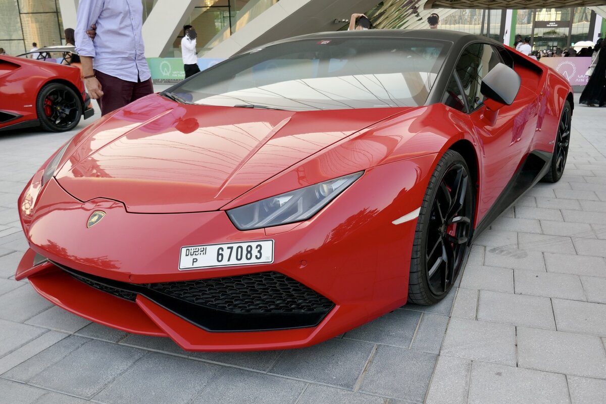 Der rote Lamborghini Huracan der am 1.12.21 vor dem Ain Dubai steht.