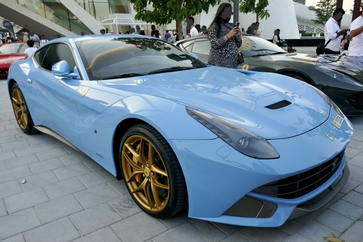 Ein blauer Ferrari 850 der am 1.12.21 vor dem Riesenrad Ain Dubai steht.