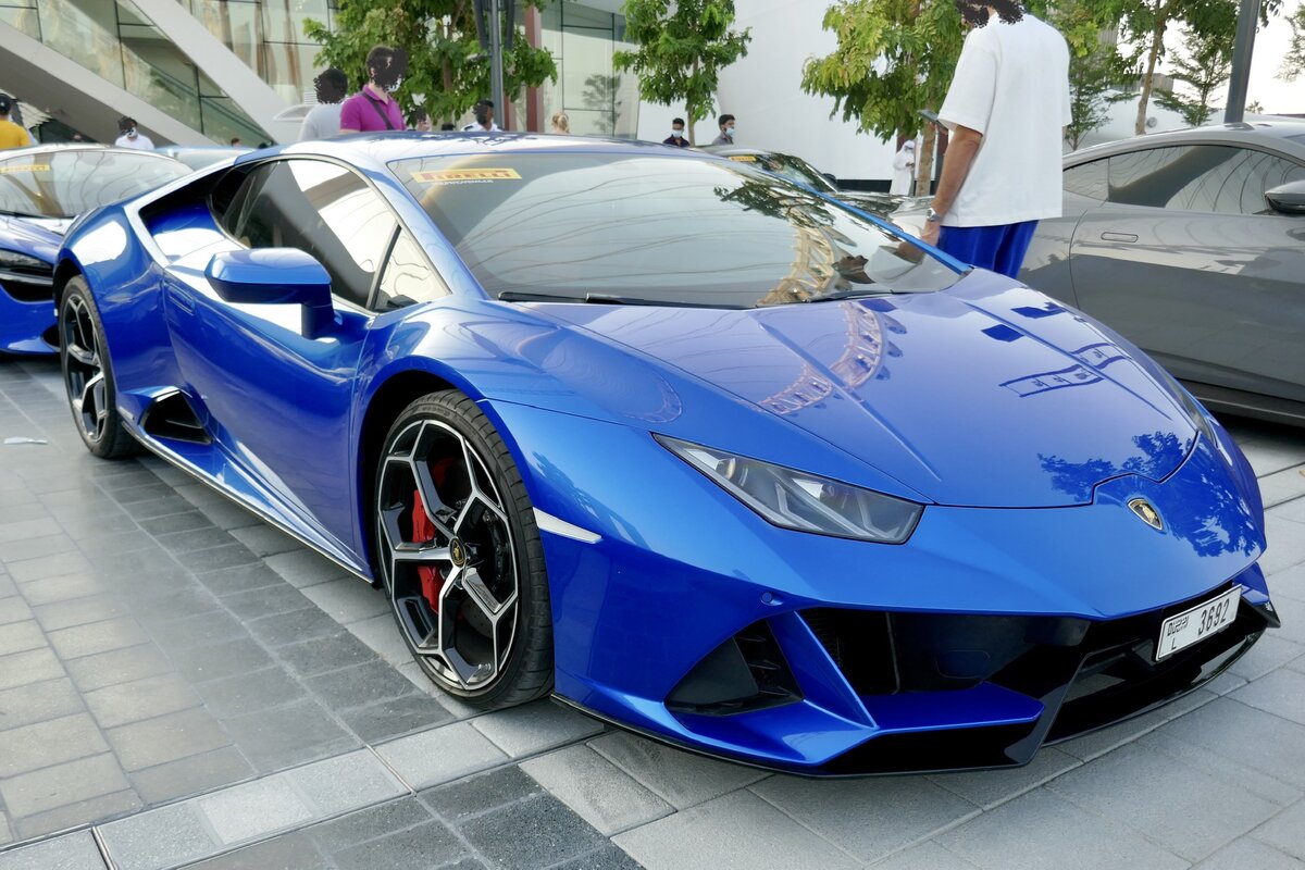 Ein blauer Lamborghini Huracan am 1.12.21 vor dem Ain Dubai.