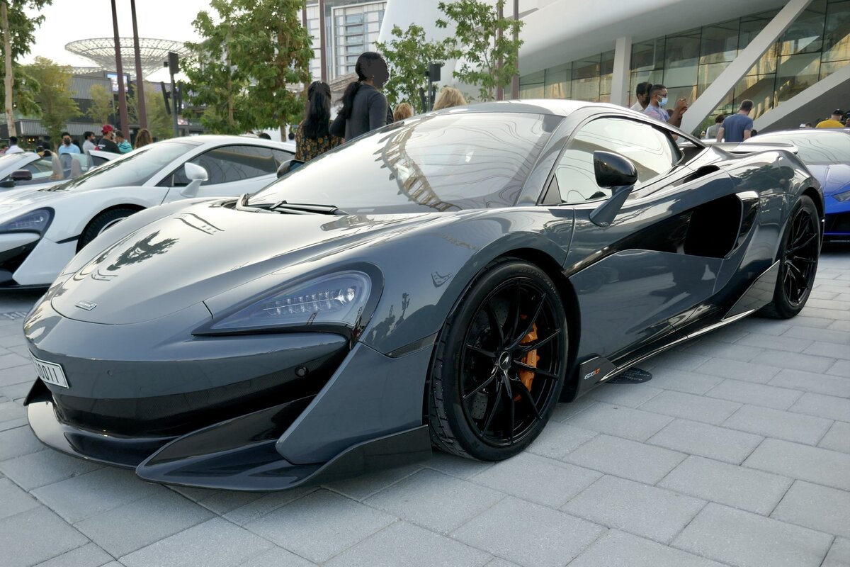 Ein dunkler McLaren 600LT am 1.12.21 vor dem Riesenrad Ain Dubai.