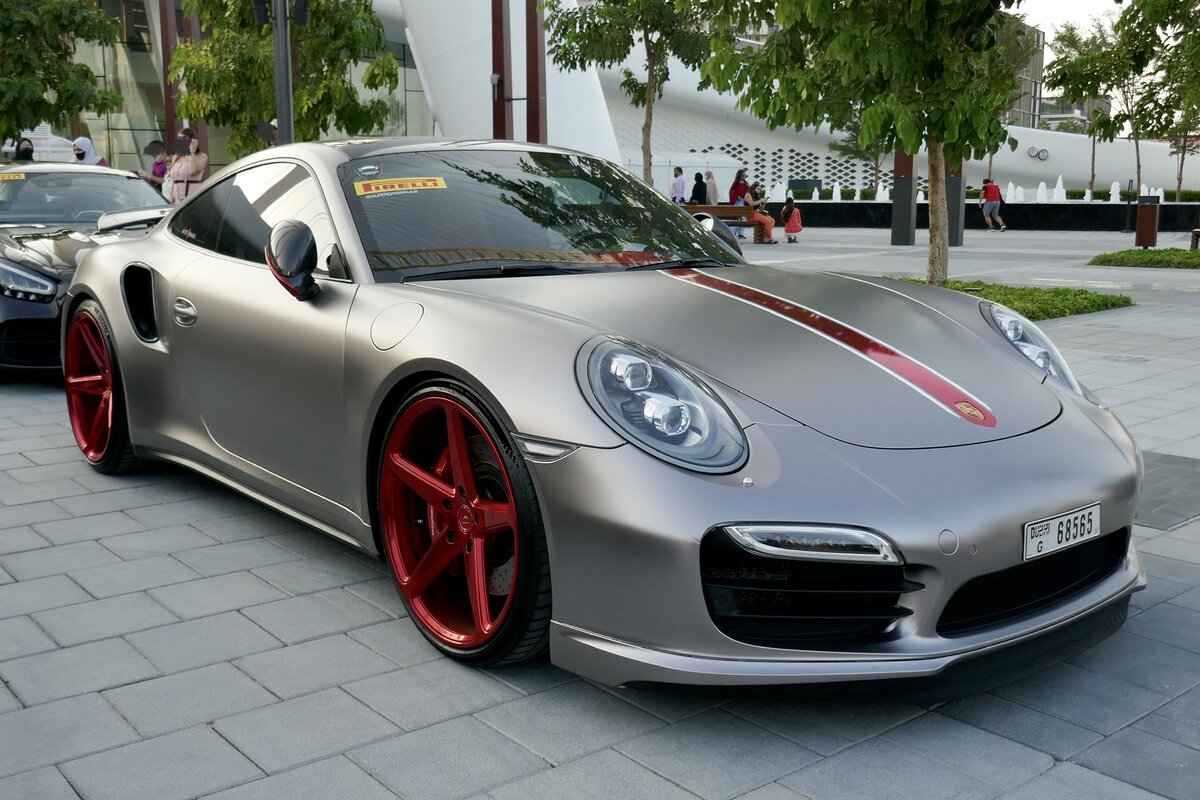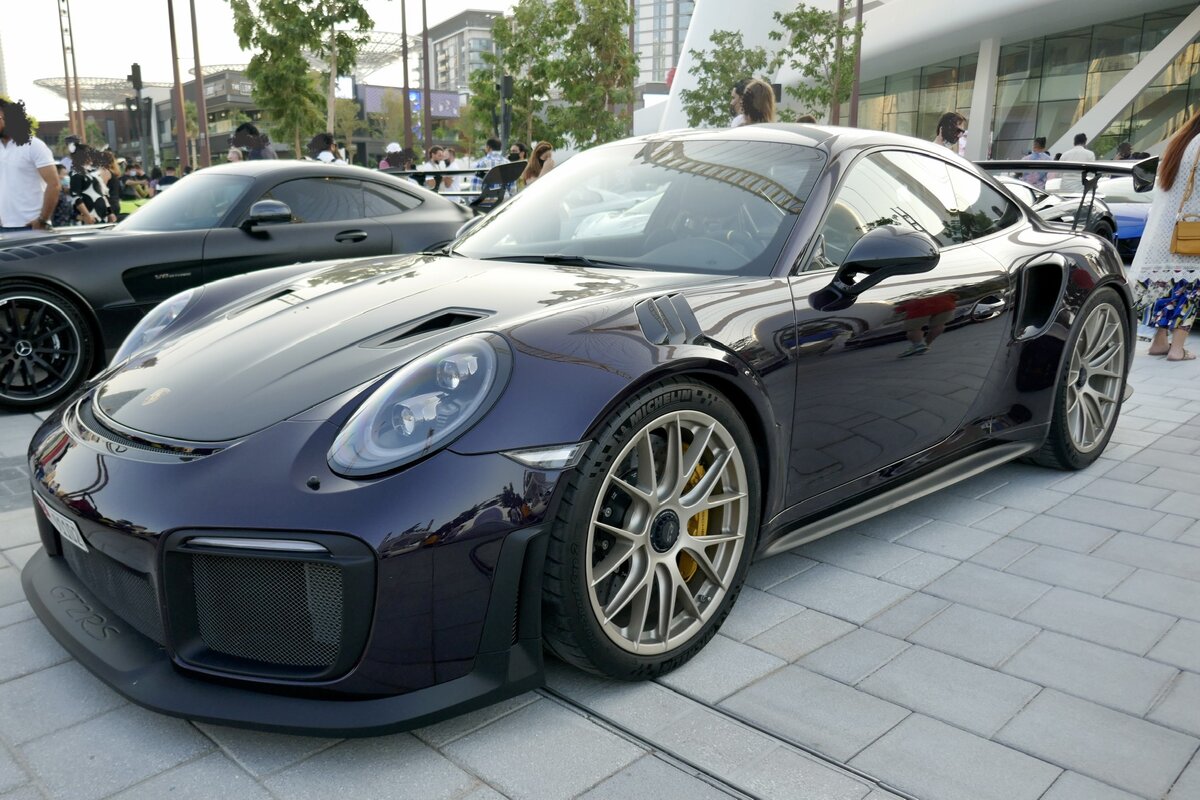 Ein dunkler Porsche 911 der am 1.12.21 vor dem Ain Dubai stand.