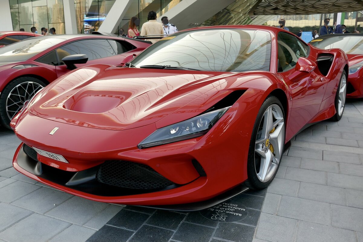 Ein roter Ferrari der am 1.12.21 vor dem Ain Dubai steht.
