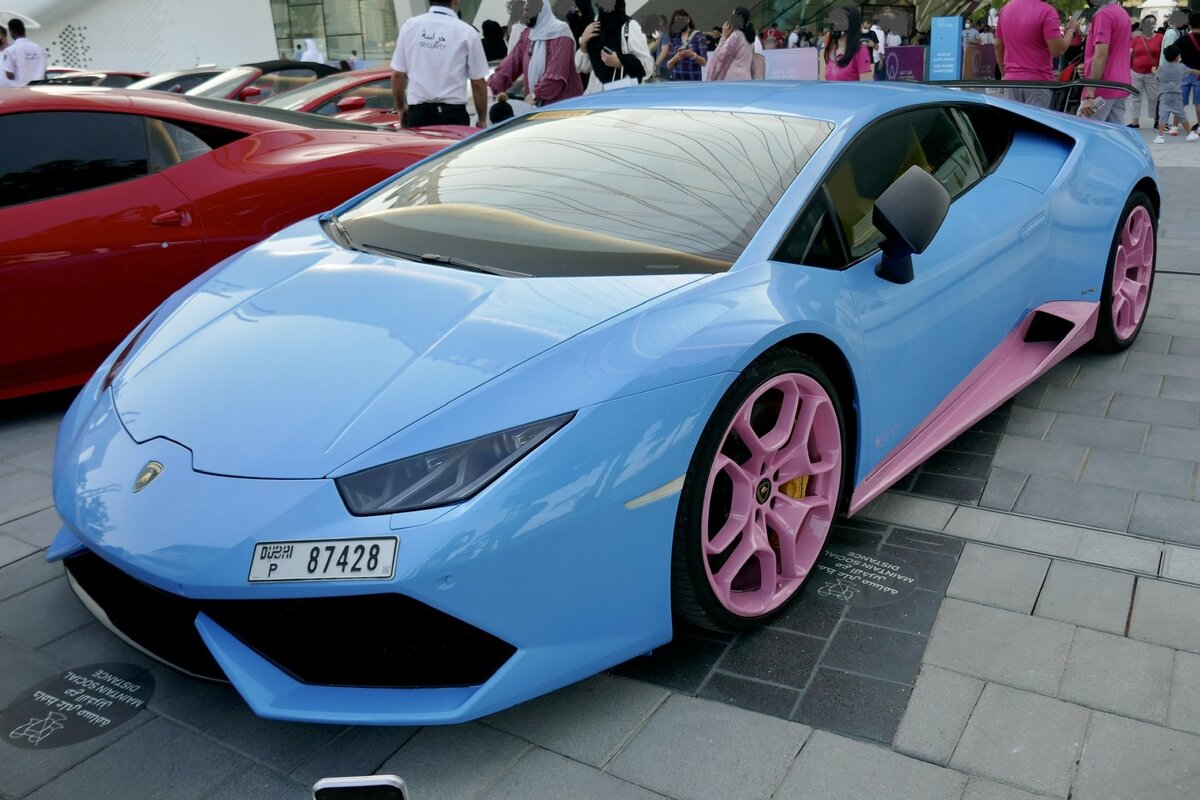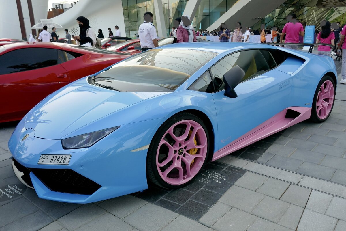 Ein pink/blauer Lamborghini Huracan am 1.12.21 vor dem Riesenrad Ain Dubai.