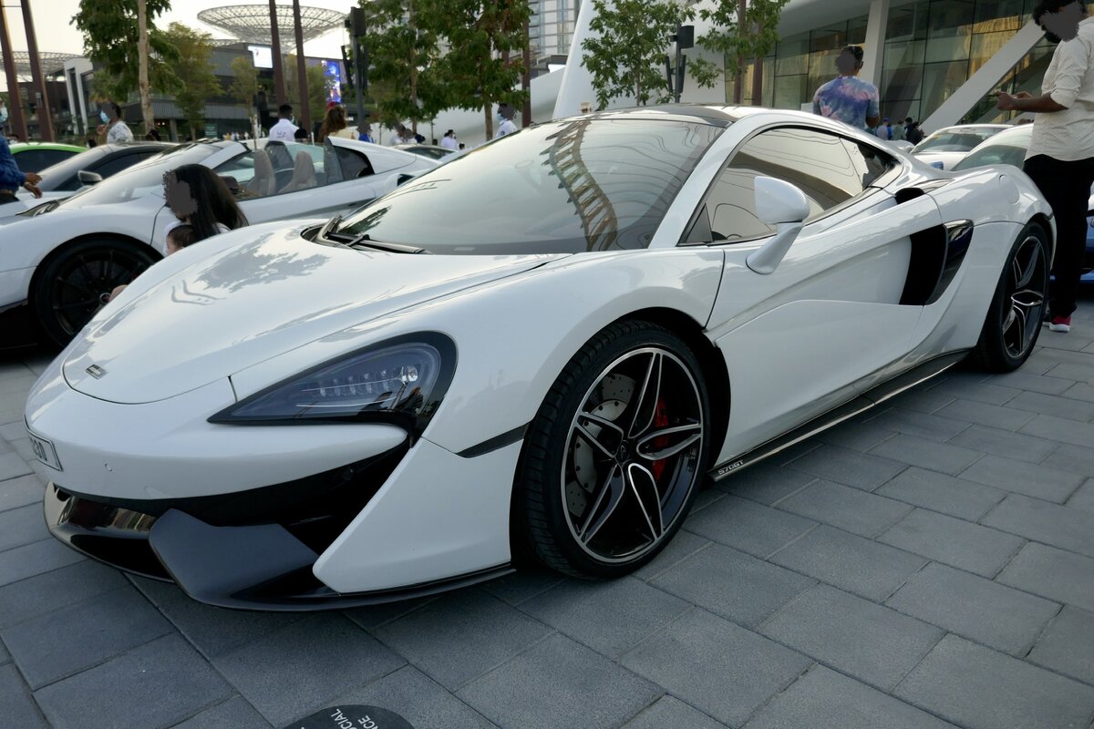 Ein weisser McLaren 570GT der am 1.12.21 vor dem Riesenrad Ain Dubai steht.