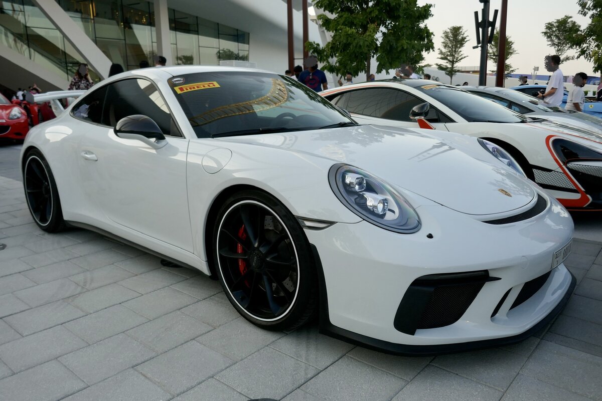 Ein weisser Porsche 911 der am 1.12.21 der vor dem Ain Dubai steht.