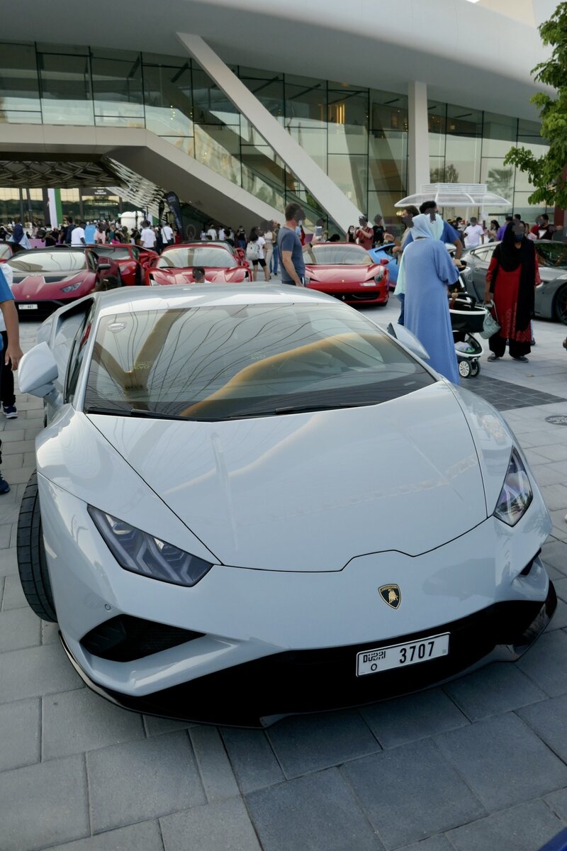 Weisser Lamborghini Huracan am 1.12.21 vor dem Riesenrad Ain Dubai.