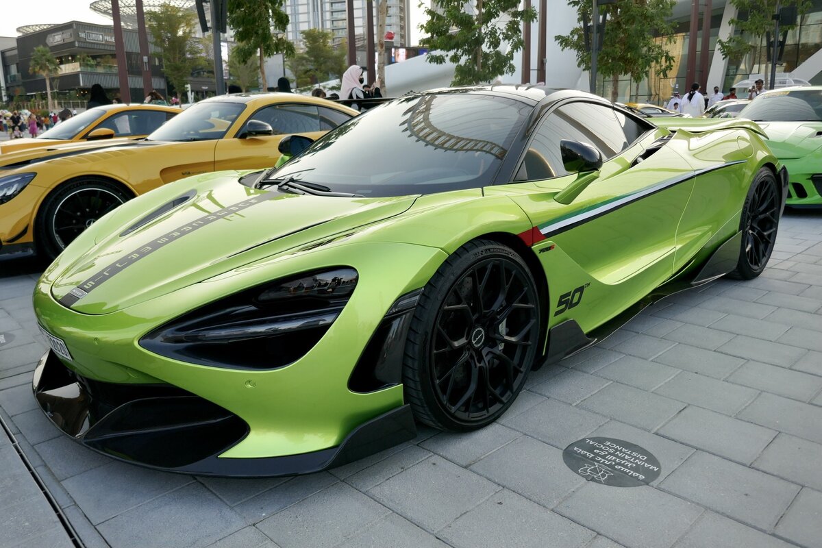 Grüner McLaren 720S mit den Landesfarben an der Tür zum 50. Nationalfeiertag, am 1.12.21 vor dem Ain Dubai.