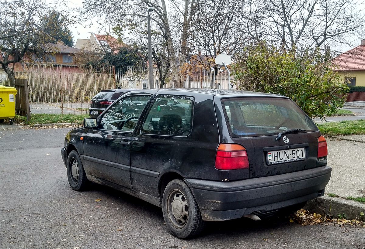 Rückansicht: dreitürer VW Golf III, gesehen in 11.2020.