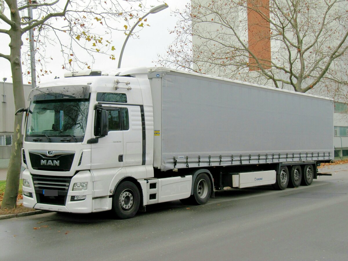 MAN TGX 18.510 Sattelzug mit KRONE-Auflieger am 19.11.2021 in Berlin.