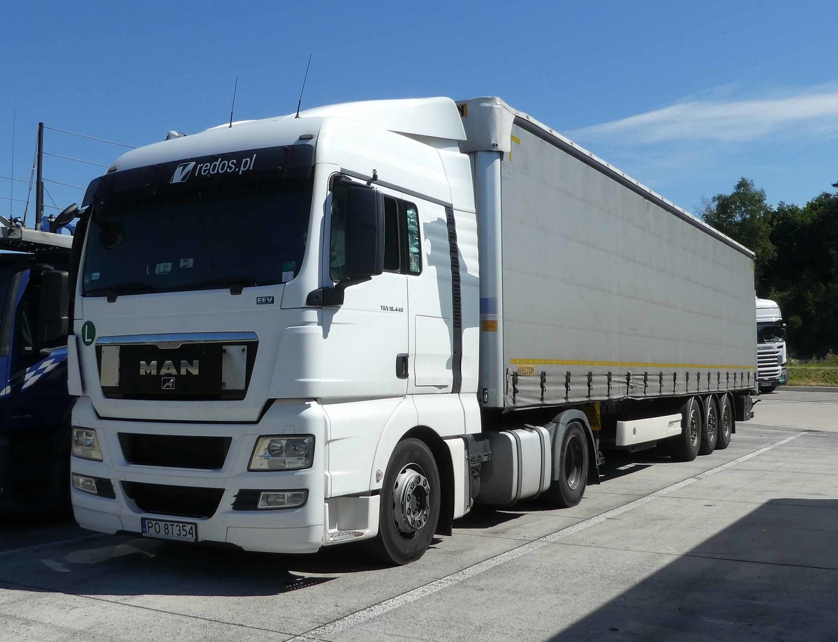=MAN-Sattelzug der Spedition REDOS rastet im Juli 2020 an der A 7