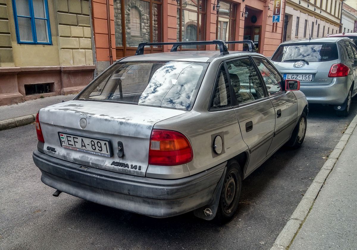 Rückansicht: Opel Astra F Sedan, gesehen in Juli 2020.