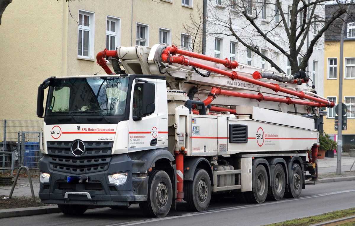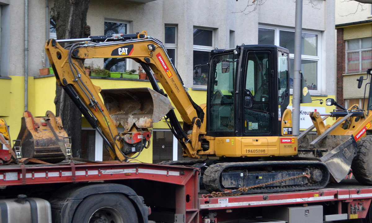 Autologistik Beckmann, Dipl.-Ing. Jörg Beckmann e. K. mit einem Sattelzug mit Ladebrücke mit zwei CAT Baumaschinen (Mietfahrzeuge) und MB ACTROS 1842 Zugmaschine am 26.01.21 Berlin Karlshorst.