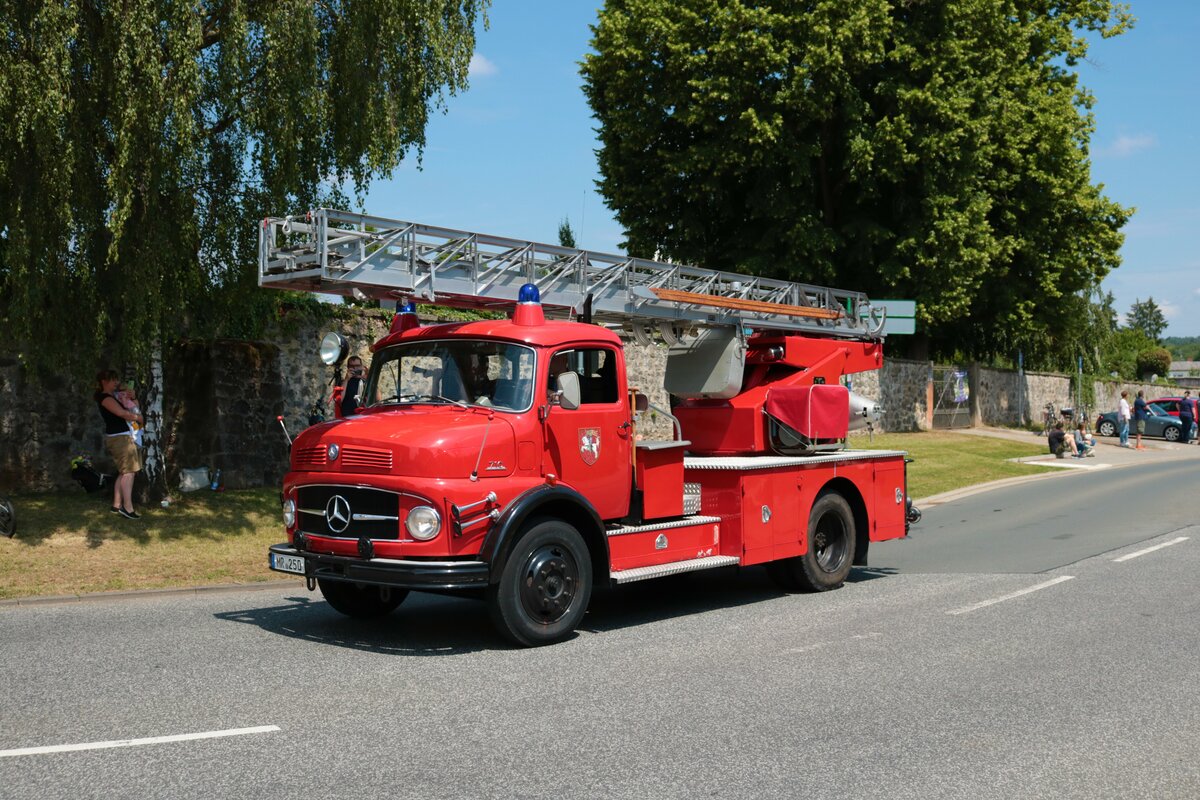 Mercedes Benz Hauber Drehleiter am 04.07.21 bei einer Oldtimer Parade zum Jubiläum 75 Jahre Kreisfeuerwehrverband Gießen in Lich (Hessen)