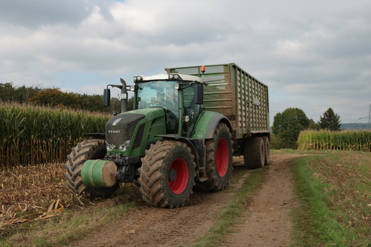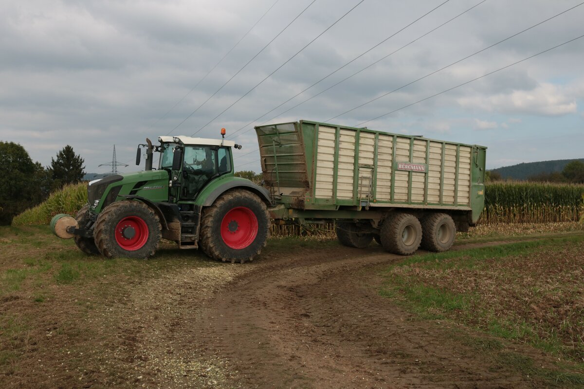 Fendt Vario 824 mit Bergmann Häckselwagen am 28.10.21 bei der Maisernte in der Wetterau