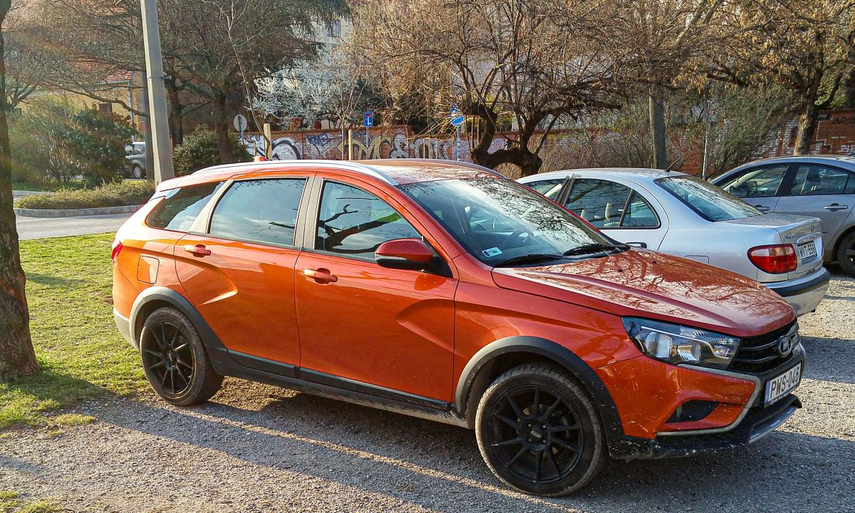 Lada Vesta SW Cross in der Farbe "Orange mars", fotografiert in 03.2021.