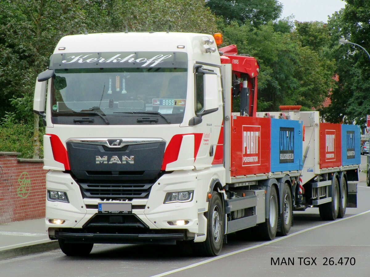 MAN TGX 26.470 Hängerzug zum Transport von Baustoffen am 21.09.2021 im Land Brandenburg. Ladekran am Heck des Motorwagens und Tandemanhänger.