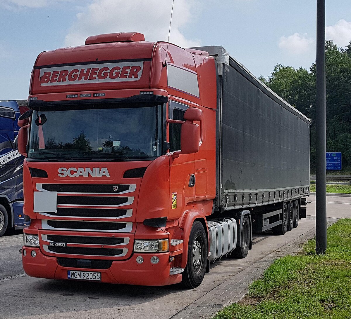 =Scania R 450-Sattelzug der Spedition BERGHEGGER (mit polnischer Zulassung) rastet an der A 7 im Juli 2021