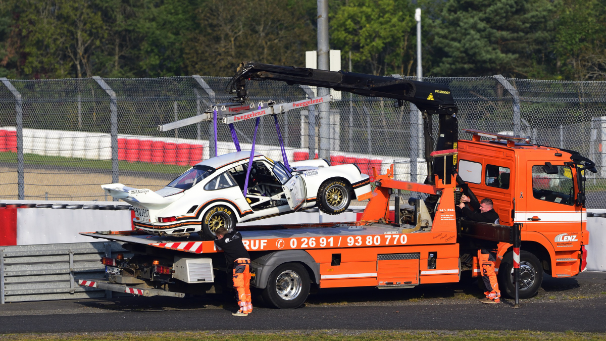 Porsche 911 RSR,Fahrer: Georg & Björn Griesemann, nach kleiner Panne auf einem Mercedes Abschleppwagen beim ADAC 1000Km Rennen am 17.Sep.2021 auf dem Nürburgring