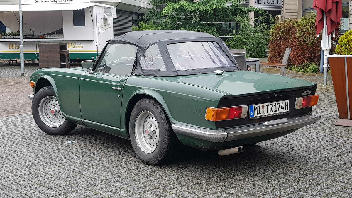 Triumph TR 6, Bj 1974, 2,5 Ltr, 6Zyl. Motor mit98 Ps, fährt auf dem Parkplatz zu seinem zugewiesenen Platz. 01.10.2021