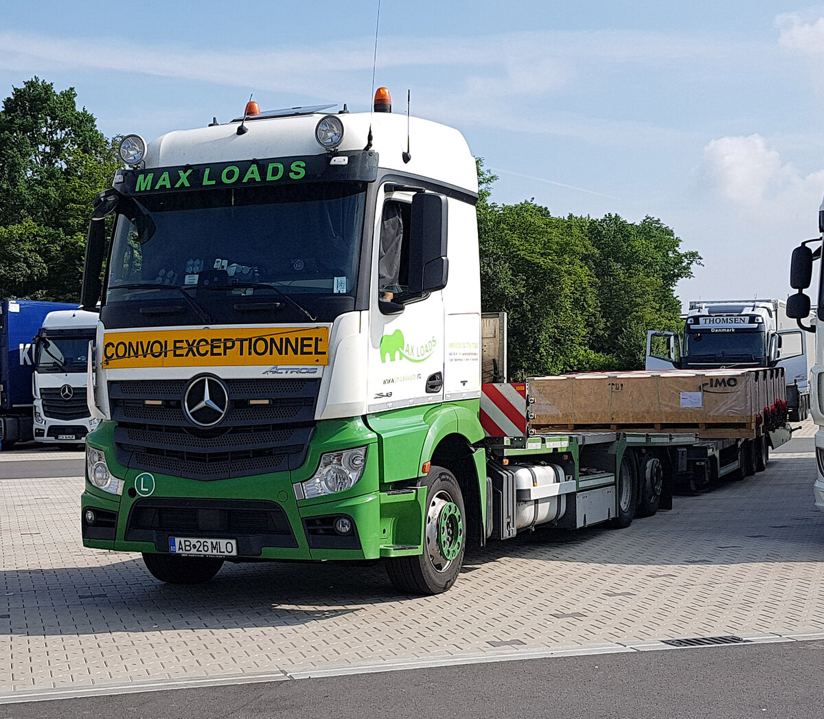 =MB Actros-Schwerlastsattelzug der rumänischen Spedition MAX LOADS rastet im Juni 2021 an der A 7