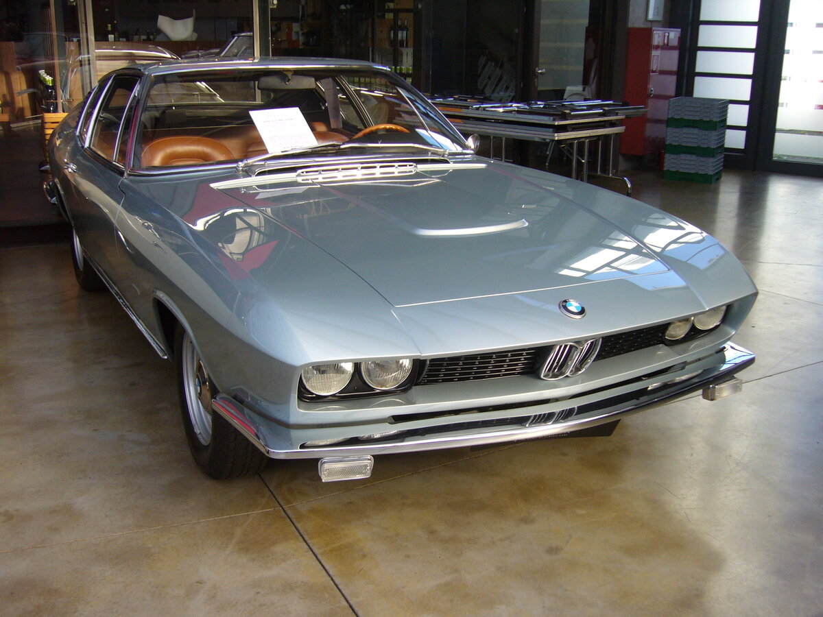 BMW 3200 CS, produziert von 1962 bis 1965. Der Entwurf und die Herstellung der Karosserie erfolgten bei der Carrozzeria Bertone/Turin. Deswegen erhielt der Wagen auch im Volksmund den Beinamen "Bertone". Von diesem Modell wurden insgesamt 537 Coupes und 1 Cabriolet ausgeliefert. Der V8-Motor hat einen Hubraum von 3168 cm³ und leistet 160 PS. Diese Motorleistung verhilft dem Auto zu einer Höchstgeschwindigkeit von 200 km/h. Der gezeigte 3200 CS wurde erstmalig im Oktober 1964 zugelassen. Er ist somit eines der letzten produzierten Fahrzeuge dieser Baureihe. Classic Remise Düsseldorf am 28.09.2021.
