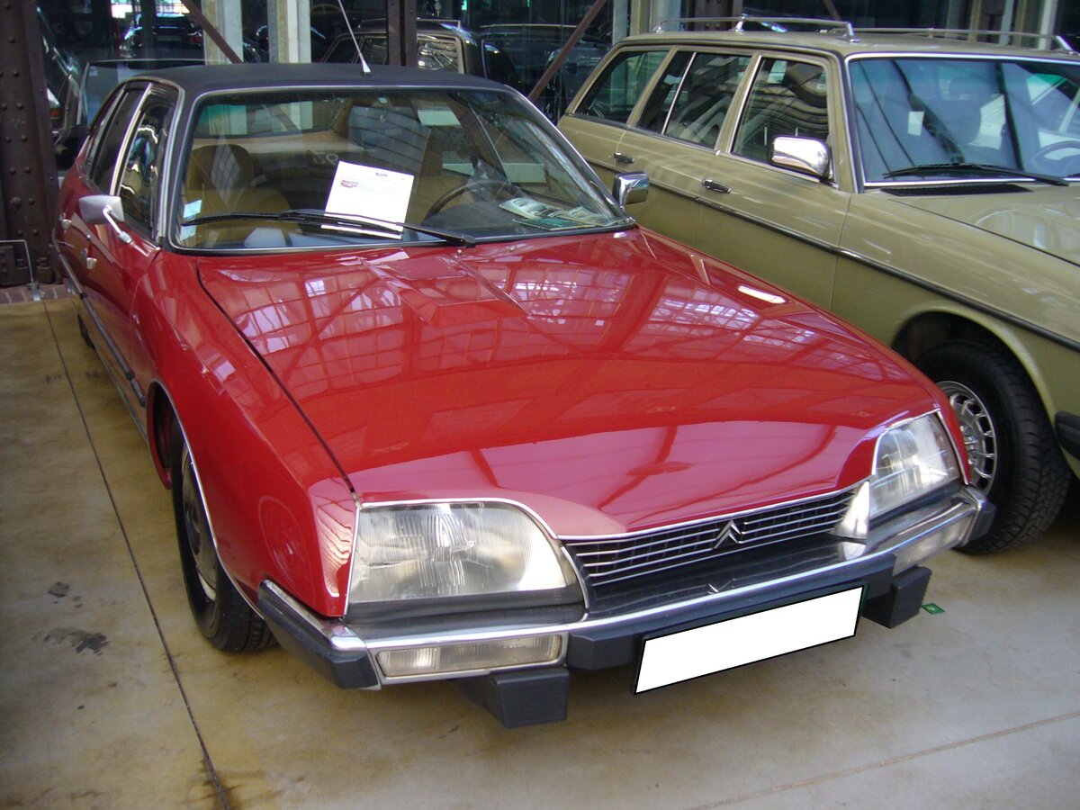 Citroen CX 2400 Pallas Berlines Essence. Die Modellreihe CX stand ab 1975 bei den Händlern. Während seiner sechszehnjährigen Produktionszeit, war die als viertürige Limousine und fünftüriges Kombimodell lieferbare CX-Baureihe mit etlichen Motorisierungen lieferbar. Hier konnte ich einen 2400 in der besonders luxuriösen "Pallas-Ausstattung" ablichten. Der Vierzylinderreihenmotor des 2400 hat einen Hubraum von 2348 cm³ und leistet 120 PS. Die Höchstgeschwindigkeit wurde von Citroen mit 186 km/h angegeben. Classic Remise Düsseldorf am 28.09.2021.