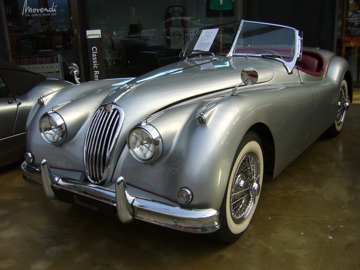 Jaguar XK 140 OTS = O pen T wo S eater aus dem Jahr 1957. Die Erstauslieferung dieses Sportwagens erfolgte nach Neuseeland. Der von 1955 bis 1957 gebaute Sportwagen hat einen Sechszylinderreihenmotor mit einem Hubraum von 3441 cm³ und einer Leistung von 190 PS. Die Spitzengeschwindigkeit gab das Werk in Coventry mit 207 km/h an. Classic Remise Düsseldorf am 28.09.2021.