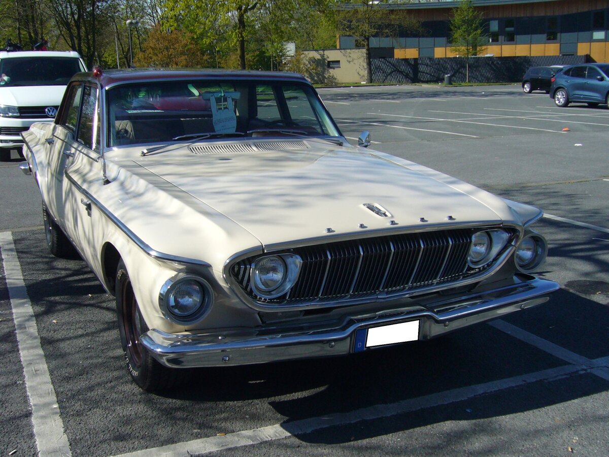 Dodge Dart Convertible aus dem Jahr 1964. Das Kompaktmodell Dart wurde im Jahr 1963 vorgestellt und war als zwei- und viertürige Limousine, fünftüriges Kombi, zweitüriges Hardtop-Coupé und als Cabriolet lieferbar. Im ersten Modelljahr konnte der Kunde zwischen zwei Sechszylinderreihenmotoren wählen: 2789 cm³ mit 102 PS und 3682 cm³ mit 147 PS. Ab dem Modelljahr wurde das Motorenprogramm um einen V8-Motor mit einem Hubraum von 4473 cm³ und einer Leistung von 182 PS ergänzt. Oldtimertreffen Café del Sol Gelsenkirchen am 18.04.2022.