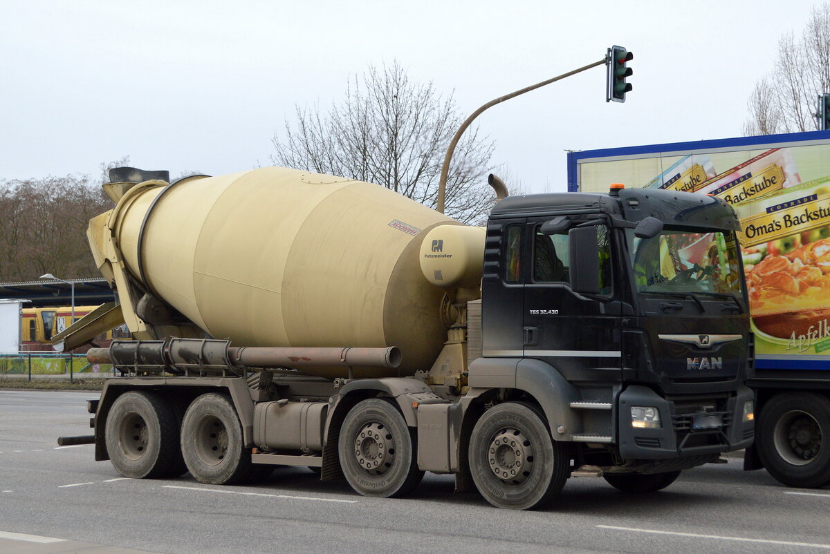 Ein MAN TGS 32.430 Betonmischfahrzeug mit Putzmeister Betonmischer am 03.02.22 Berlin Marzahn.