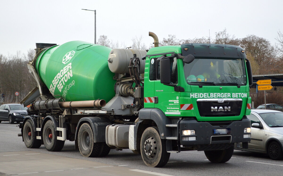 Heidelberger Beton GmbH - Region Nordost/ Berlin u. Brandenburg mit einem MAN TGS 18.440 Betonmischer-Sattelzug am 03.02.22 Berlin Marzahn.