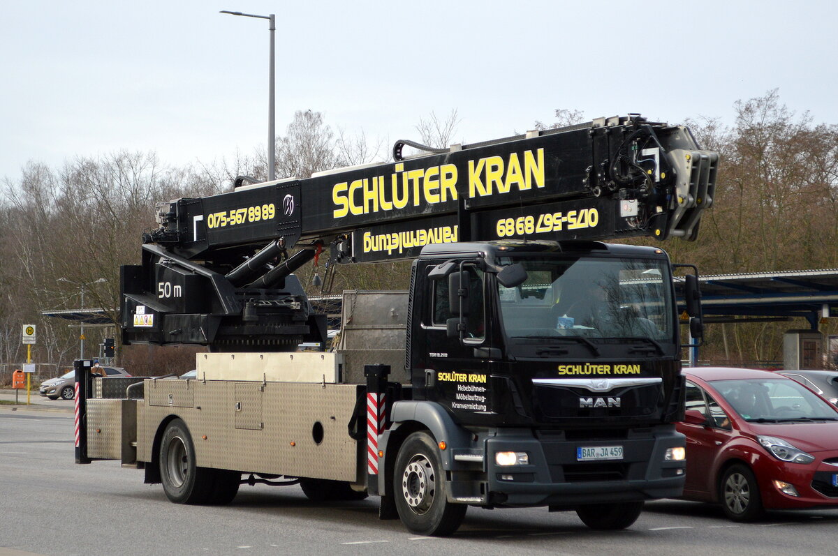 Mike Schlüter - Hebebühnenmietservice/ SCHLÜTER KRAN mit einem MAN TGM 18.290 LKW mit Sonderaufbau mit wohl 50 Meter ausfahrbarem Teleskoparm für Hebetätigkeiten am 03.02.22 Berlin Marzahn.