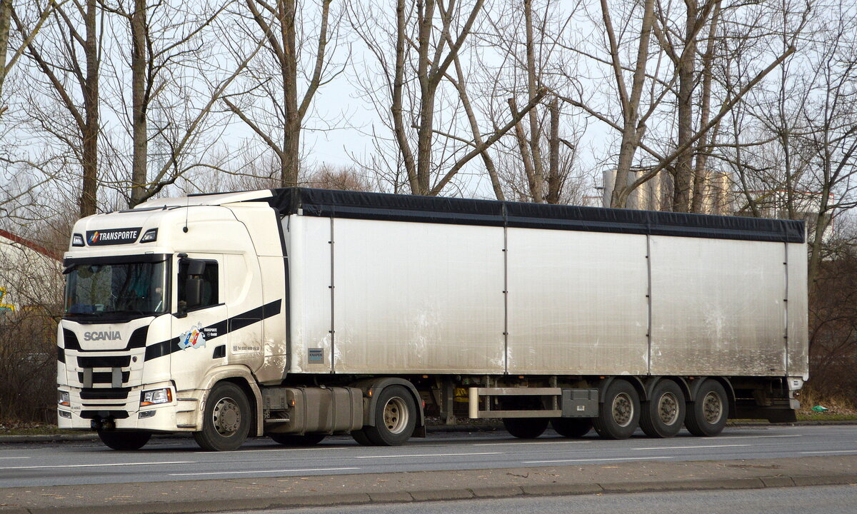 Gilles Internationale Spedition GmbH & Co. KG mit Sattelzug und moderner SCANIA S 450 Zugmaschine am 03.02.22 Berlin Marzahn.