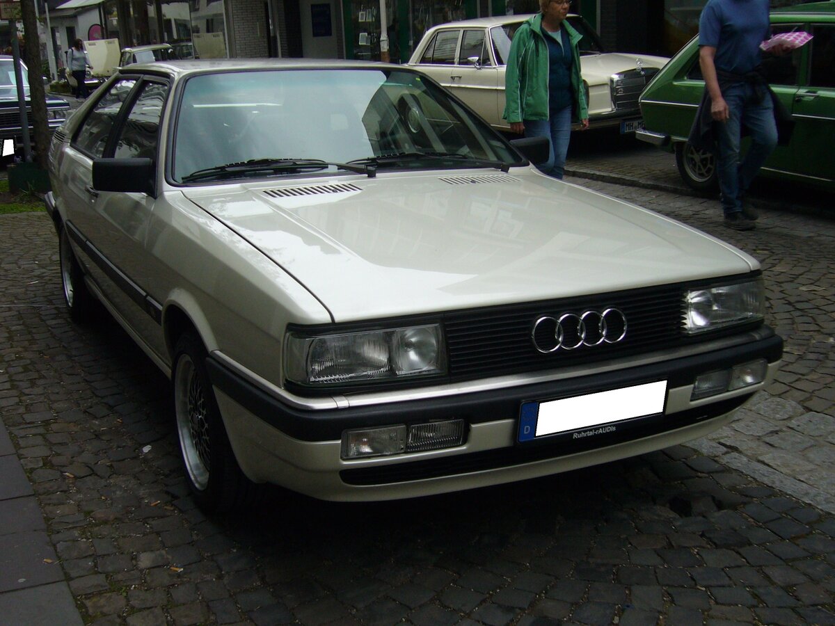 Audi Coupe der zweiten Serie, wie es von 1984 bis 1987 produziert wurde. Im März 1980 wurde die "Fahrmaschine" Audi Quattro vorgestellt. Im September 1980 folgte das ähnlich aussehende Coupe, ohne jedoch auf Allradtechnik zurück greifen zu können. Im September 1984 erfolgte ein "Facelift", äußerlich erkennbar am leicht schräg gestellten Kühlergrill und den rechteckigen Frontscheinwerfern. Ein solches Coupe war 1984 ab DM 24.340,00 zu haben. Der Kunde konnte zwischen einem Vierzylinderreihenmotor mit einem Hubraum von 1781 cm³ und Leistungen von 75 PS oder 90 PS, oder einem Fünfzylinderreihenmotor mit einem Hubraum von 1921 cm³ und einer Leistung von 115 PS wählen. Oldtimertreffen des AMC Essen-Kettwig am 01.05.2022.