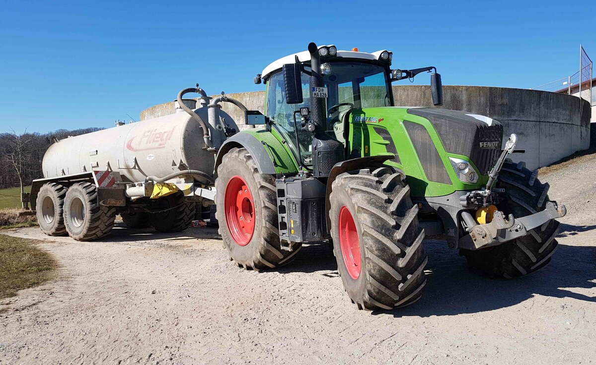 =Fendt Vario 826 eines Rhöner Selbstvermarkters mit FLIEGL-Güllefaß, 03-2022