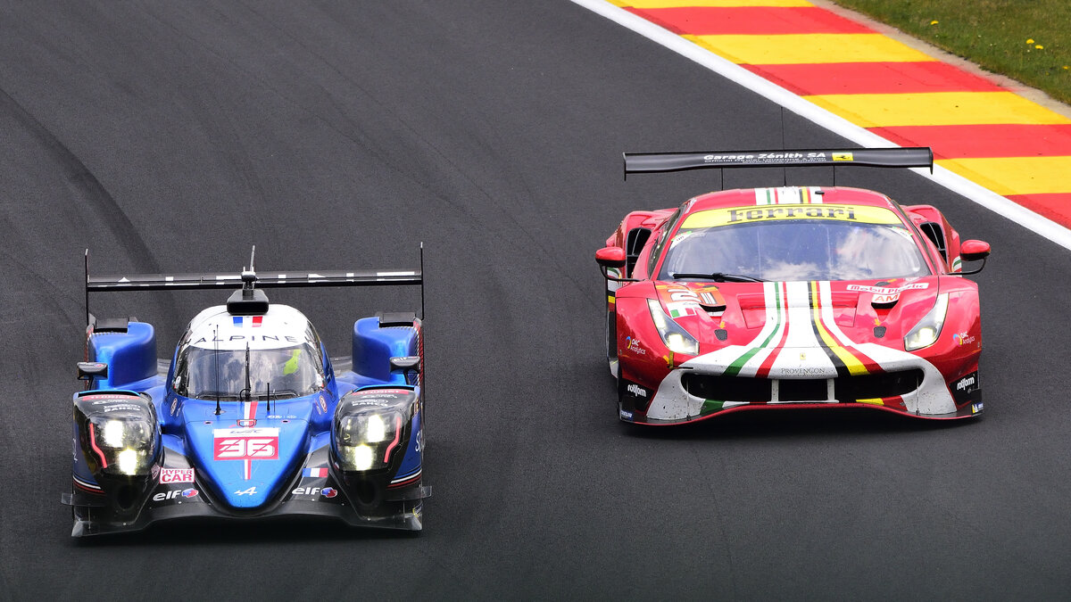 Auf der Rennstrecke in Spa ex LMP1 jetzt bei den Hypercars # 36 Renault Alpine A480, beim überholen des LM GTE Am Ferrari 488 GTE EVO, FIA WORLD ENDURANCE CHAMPIONSHIP 2022 / 6 HOURS OF SPA-FRANCORCHAMPS 7.Mai 2022