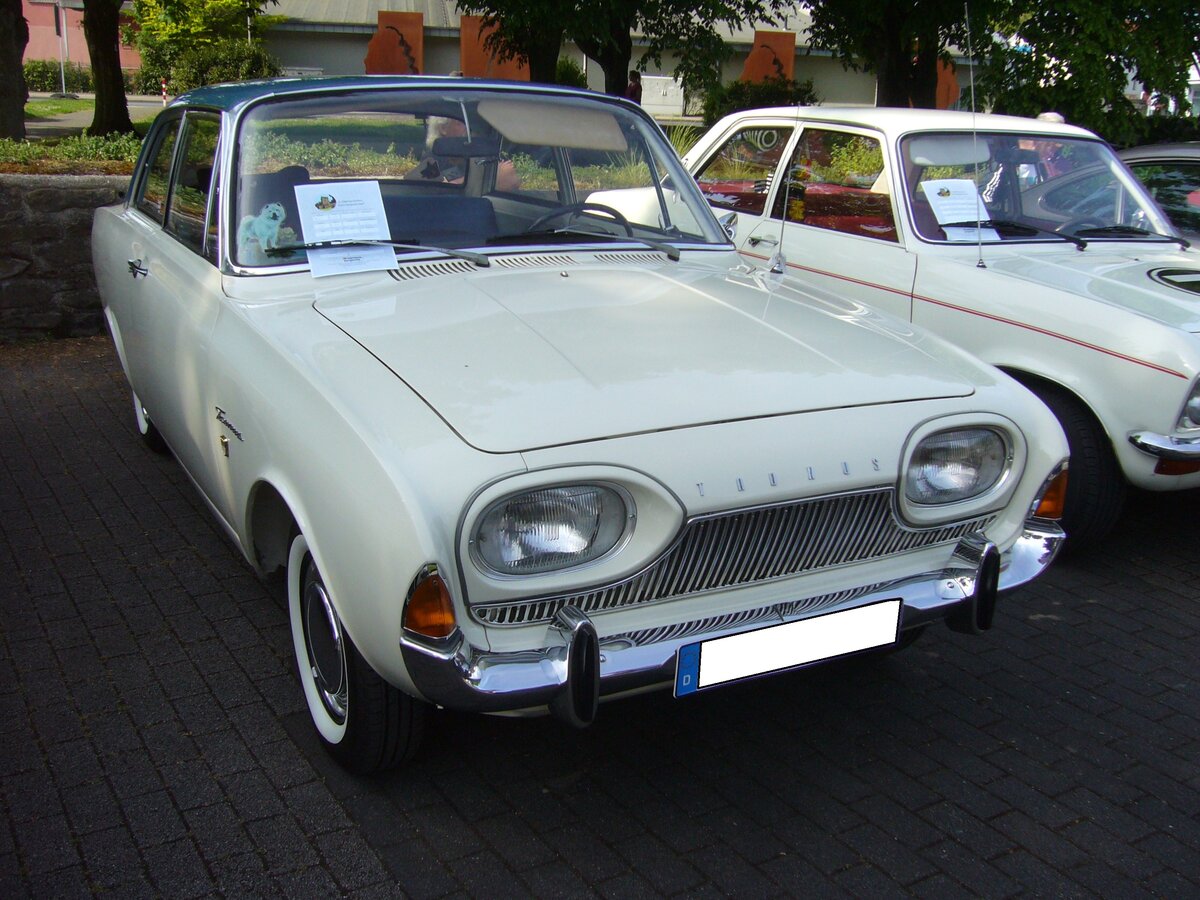 Ford Taunus P3 in der Karosserieversion zweitürige Limousine, gebaut von 1960 bis 1964. Die Werbung für diesen Wagen sprach von der "Linie der Vernunft", der Volksmund nannte den Wagen "Badewanne". Der P3 war mit folgenden Vierzylinderreihenmotoren lieferbar: 1498 cm³ mit 55 PS, 1698 cm³ mit 60 PS (ab 09. 1963) 65 PS. 1961 kam noch ein aufgebohrter Motor mit 1758 cm³ Hubraum hinzu, der 70 PS (ab 09. 1963) 75 PS leistete. Oldtimertreffen in Essen-Burgaltendorf am 15.05.2022.