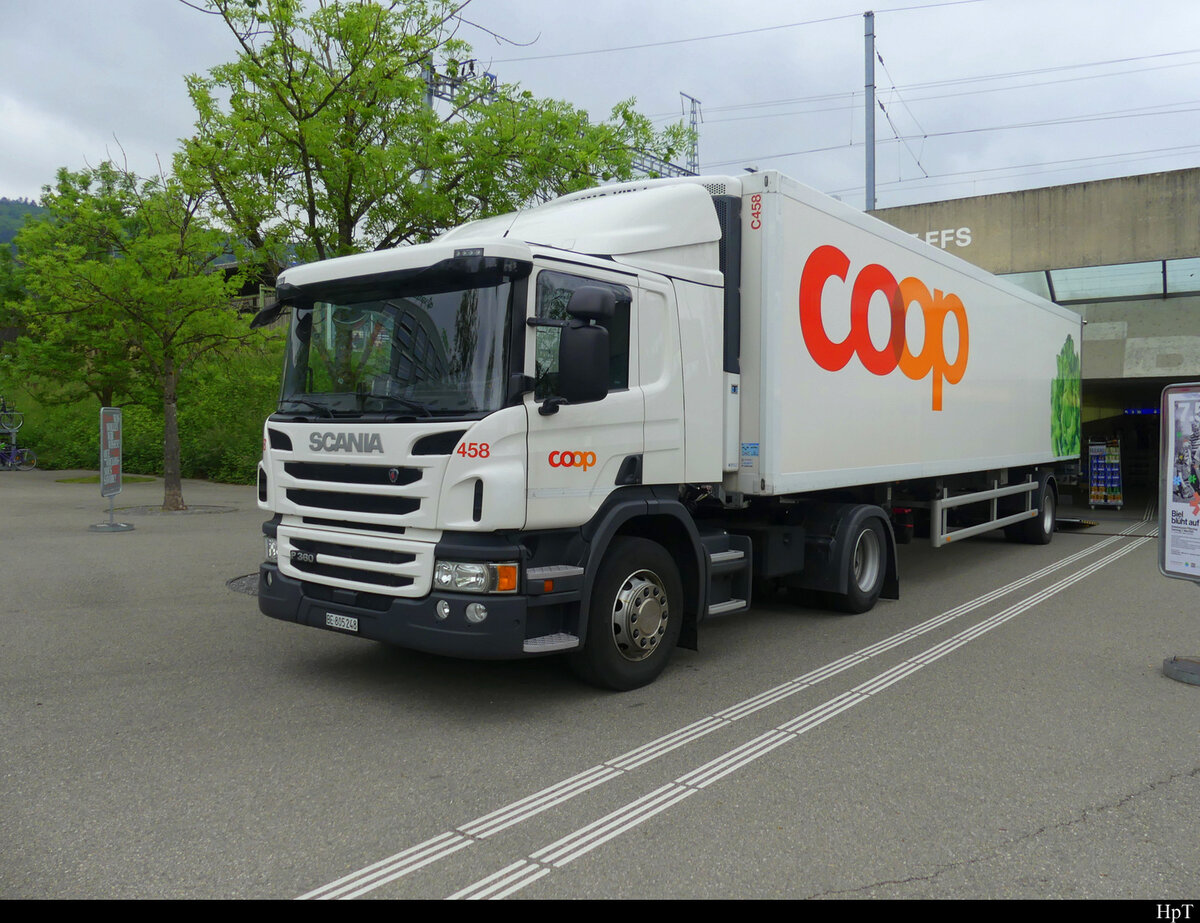 LKW - Scania P360 Sattelschlepper vor dem Bahnhof Biel am 06.05.2022