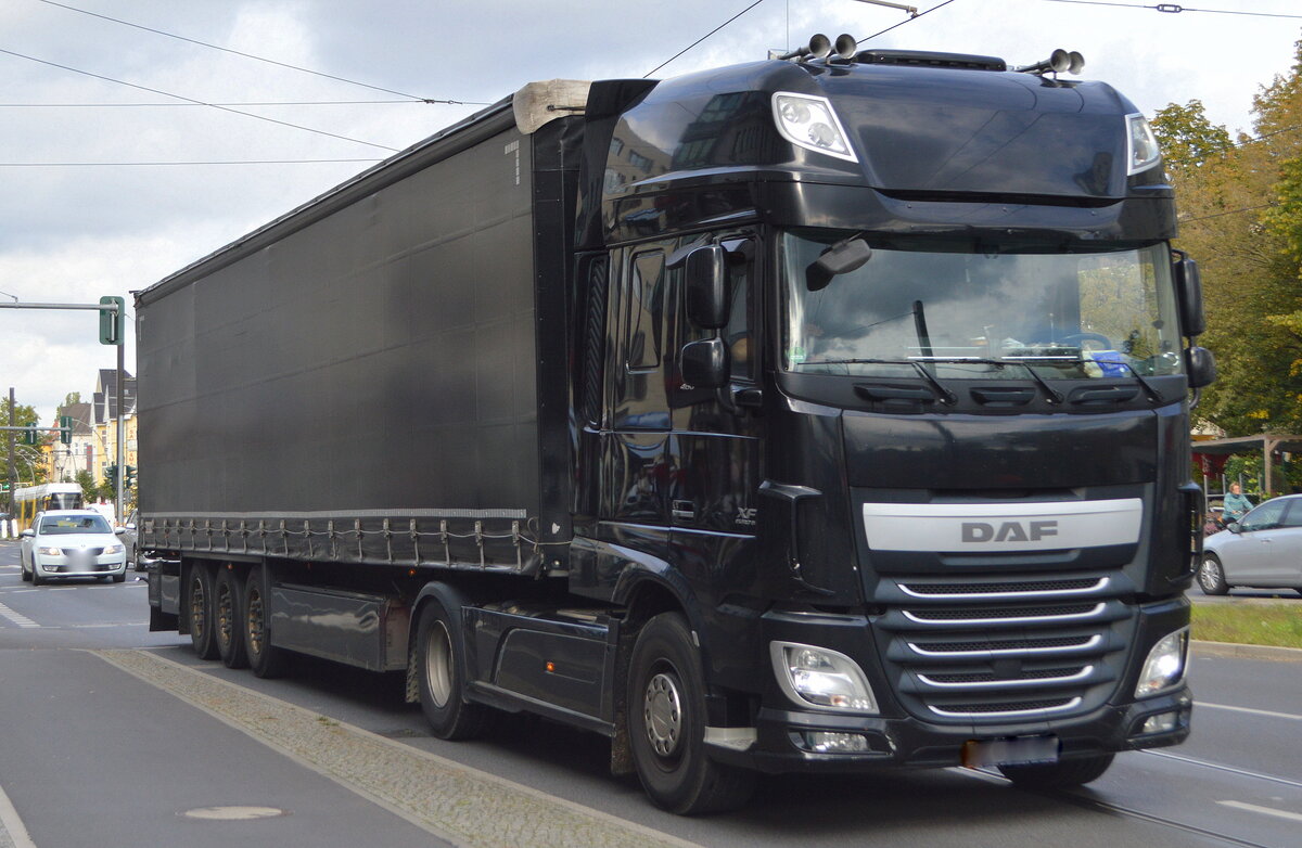 Ein schwarzer Sattelzug mit DAF XF EURO6 460 Zugmaschine am 04.10.22 Berlin Karlshorst.