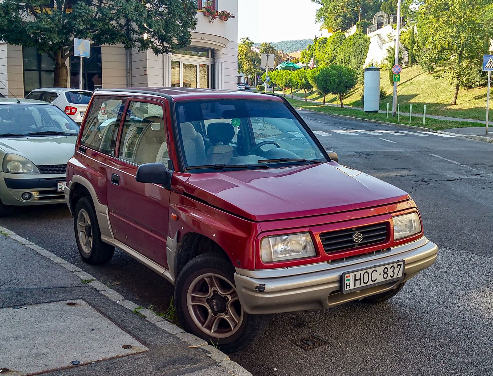 Rückansicht: Suzuki Vitara in Cassis Red (modelljahr 2001). Foto: August, 2021.