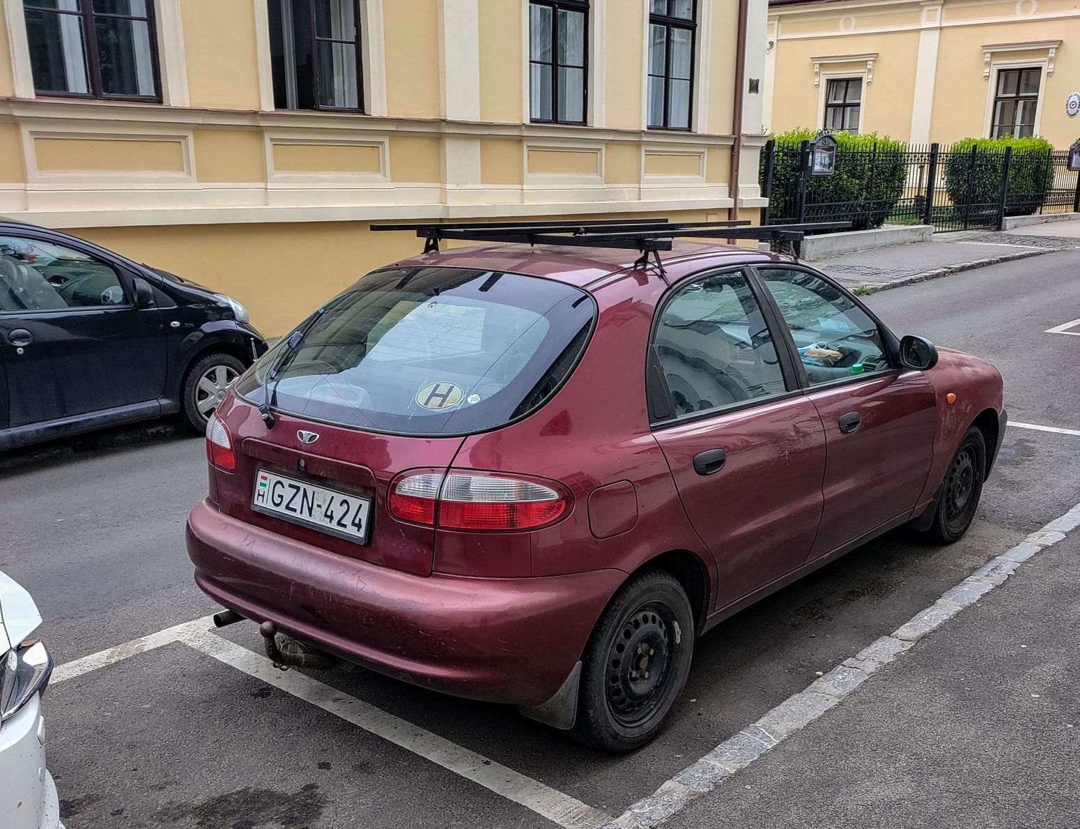 Rückansicht: Daewoo Lanos hatchback in der Farbe "Spinal Red". Foto: 05.2022